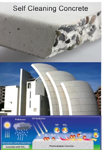 بتن خود تمیزشونده حاوی پوشش های نانوساختار فتوکاتالیستی است. بهترین عامل فتوکاتالیک به کار رفته در بتن نانوذرات دی اکسید تیتانیوم می باشد. دى اکسیدتیتانیوم از طریق واکنش هاى فوتوکاتالیستى قوى قادر به شکستن و تجزیه آلایند ه هاى آلى، ترکیبات آلى فرار و غشاى باکترى ها است. این نوع بتن برای نمای ساختمان ها مناسب است.